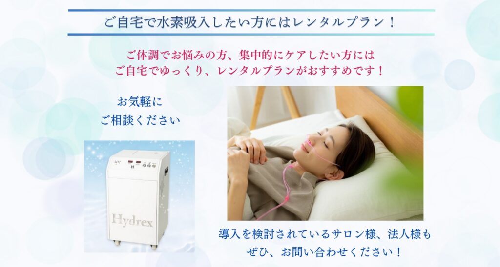 また、ご自宅で好きな時間に好きなだけ水素ケアしたい方には、レンタルプランのご用意もございますので、お気軽にご相談くださいませ。